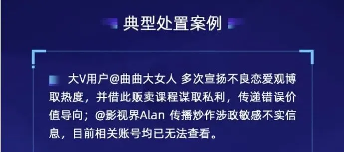 2023年12月18日,@微博管理员 公布了微博平台新一周的典型处置案例,其中就包括了情感大V“曲X”,据公示,账号违规原因是“多次宣扬不良恋爱观博取热度,并借此贩卖课程谋取私利,传递错误价值导向”。